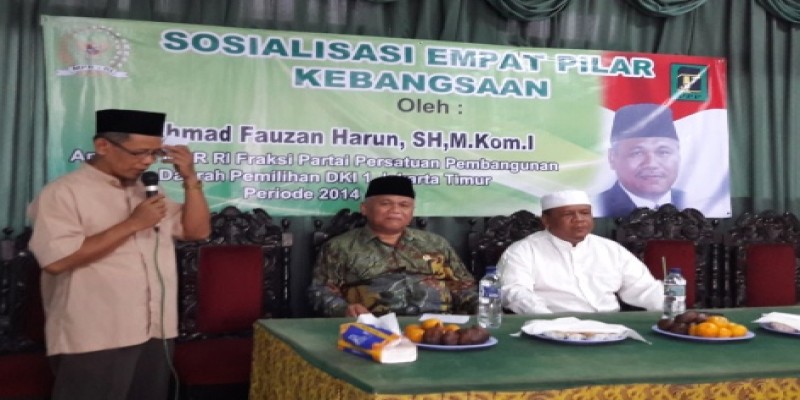 VISIONE.CO.ID, Jakarta – Empat pilar kebangsaan harus senantiasa ditanamkan dalam jiwa anak bangsa. Maka itu, sosialisasi nilai-nilai yang terkandung pada empat pilar kebangsaan tersebut harus terus dilakukan. Demikian disampaikan Anggota DPR/MPR RI Achmad Fauzan Harun pada kegiatan sosialisasi empat pilar kebangsaan yang digelar di Aula KUA, Kecamatan Makassar, Jakarta Timur beberapa waktu lalu.