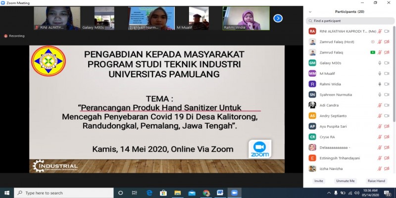Pemalang, Kamis 14 Mei 2020, Dosen & Mahasiswa Program Studi Teknik Industri, mengadakan rangkaian kegiatan pengabdian kepada masyarakat secara Daring via Zoom pada hari Kamis, 14 Mei 2020 dengan Judul “Perancangan Produk Hand Sanitizer Untuk Mencegah Penyebaran Covid 19 Di Desa Kalitorong, Randudongkal, Pemalang, Jawa Tengah”. Kegiatan diadakan di Desa Kalitorong, Kecamatan Randudongkal, Kabupaten Pemalang, Provinsi Jawa Tengah, Dosen yang terlibat dalam kegiatan ini terdiri dari Ketua Pengusul, Rini Alfatiyah, S.T, M.T, CMA, Narasumber Adi Candra, S.T. M.T., Estiningsih Trihandayani, S.T. M.T., M.Mualif, S.Pdi, M.Pdi dan Sofian Bastuti, S.T. M.T. Serta empat orang mahasiswa semester enam yakni, Cryse Riswanti Aprilianingsih,Izzha Naviza Bahranizha, Tri Prahasta dan Neng Ita Rosita