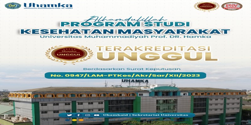 Program Studi Kesehatan Masyarakat Fakultas Ilmu-ilmu Kesehatan (FIKES) Universitas Muhammadiyah Prof. DR. HAMKA (Uhamka) meraih akreditas unggul melalui Surat Keputusan Pengurus Perkumpulan Lembaga Akreditasi Mandiri Pendidikan Tinggi Kesehatan Indonesia (Perkumpulan LAM-PTKes) berdasarkan nomor 0947/LAM-PTKes/Akr/Sar/XII/2023 pada tanggal 22 Desember 2023 dengan masa berlaku 5 tahun.