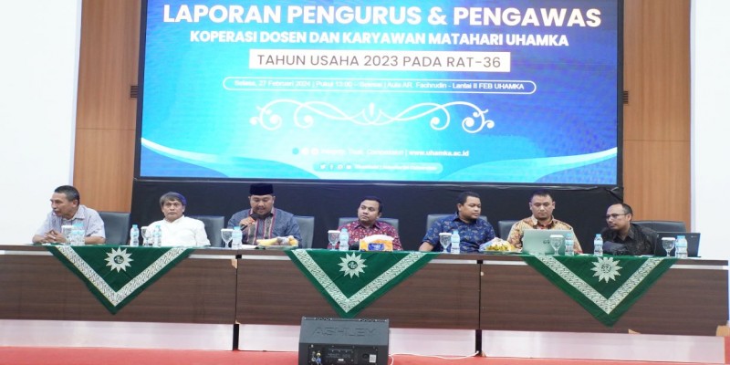 Koperasi Dosen dan Karyawan (KDK) Matahari Universitas Muhammadiyah Prof. DR. HAMKA (Uhamka) mengadakan kegiatan Laporan Pengurus dan Pengawas Koperasi Dosen dan Karyawan Matahari Uhamka Tahun Usaha 2023 pada Rapat Anggota Tahunan (RAT) ke-36 yang diselenggarakan di Aula A.R Fachrudin, Lantai 2, Fakultas Ekonomi dan Bisnis (FEB) Uhamka, Selasa. (27/2)