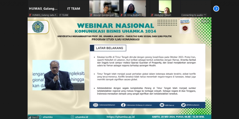 Fakultas Ilmu Sosial dan Ilmu Politik (FISIP) Universitas Muhammadiyah Prof. DR. HAMKA (Uhamka) mengadakan kegiatan Webinar Komunikasi Bisnis Uhamka 2024 dengan mengangkat tema Dinamika Ekonomi Politik Internasional di Tengah Konflik Timur Tengah dan Dampaknya Terhadap Perekonomian Indonesia yang diselenggarakan di Aula Lantai 4, Kampus Limau Uhamka, Sabtu. (25/5)