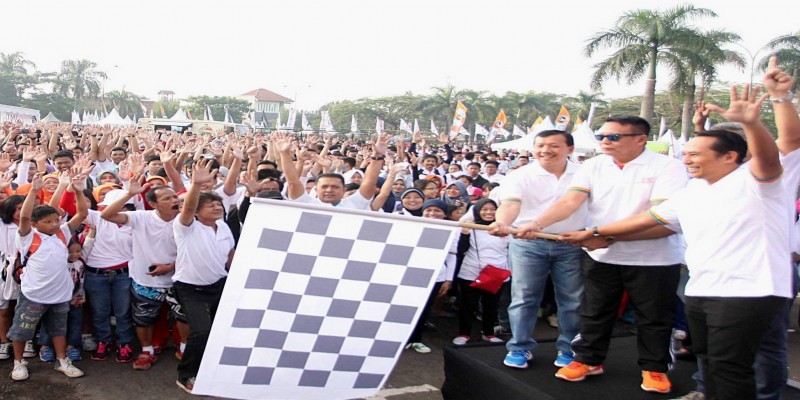 Ketua DPD PDIP Jawa Barat TB Hasanuddin ditemani Ketua DPD TMP Jawa Barat Nico Siahaan saat melepas pesesta creative run di Lapangan Monumen Perjuangan Rakyat Jawa Barat, Bandung (24/4).